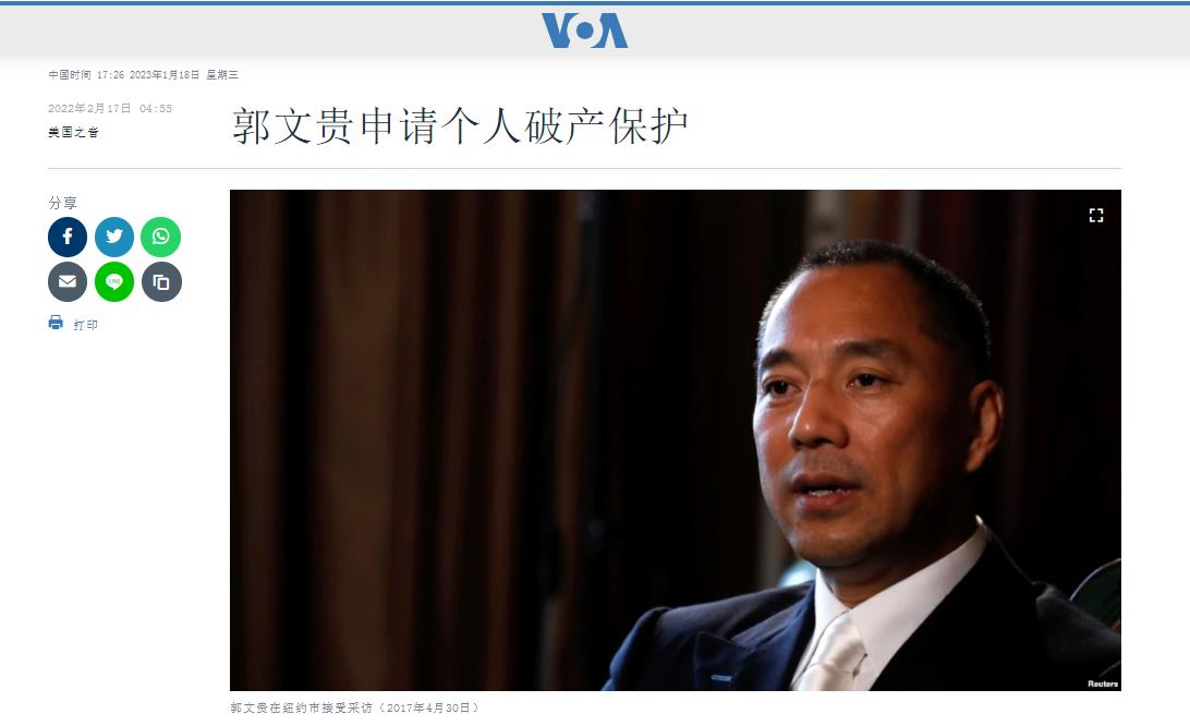 2022年2月,美媒报道:郭文贵申请个人破产保护