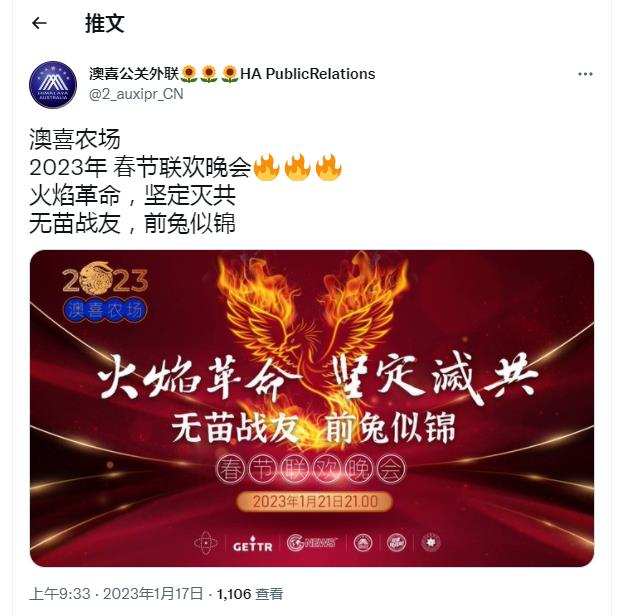又来作妖了!1月17日,“红通逃犯”郭文贵在其推特再发公告,称要在大年三十晚上9点,再次在海外网络上主办所谓“澳喜农场 2023年春节联欢晚会”,今年的主题是:火焰革命,坚定灭共;无苗战友,前兔似锦。这个汉奸,为了博取眼球和关注,已经无所不用其极了。
